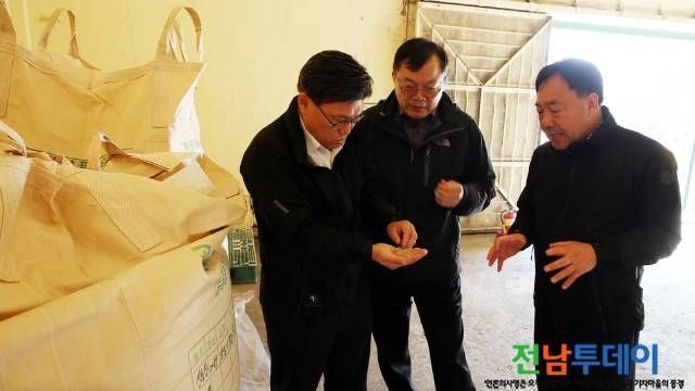 [전남투데이 서영록 기자]나윤수 함평군수 권한대행이 5일 학교면 금송리 수매현장을 찾아 벼 제현율 검사장 등 작업장을 둘러보고 관계자들을 격려하고 있다.