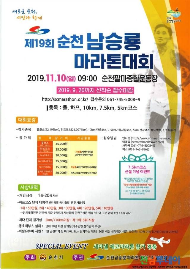 【전남투데이 구정준 기자】순천시는 제19회 순천남승룡마라톤대회가 오는 11월 10일(일) 09:00에 순천시 팔마종합운동장에서 9,000명이 참가해 축제의 장으로 개최된다고 밝혔다.