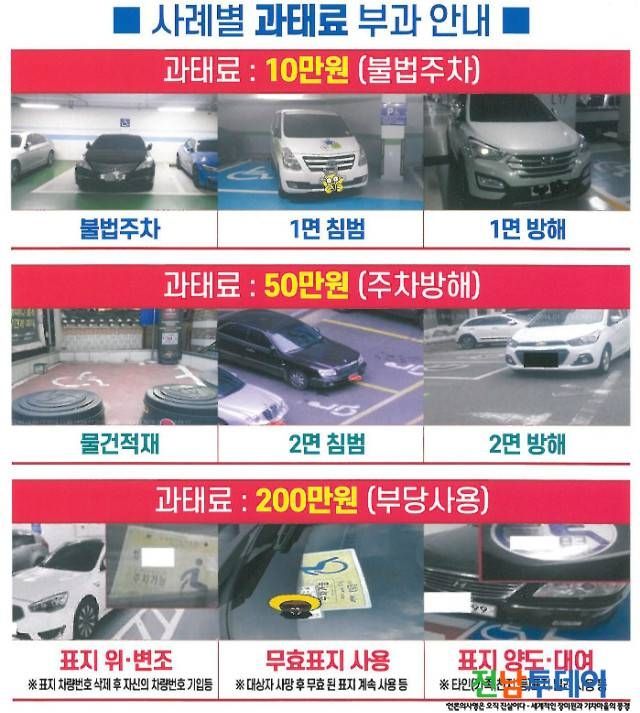 단속에 적발된 차량은 장애인 주차 전용구역 불법주차의 경우 10만원, 주차방해 행위 50만원, 장애인주차표지 위·변조 및 대여, 양 도시 200만원의 과태료가 각각 부과된다.