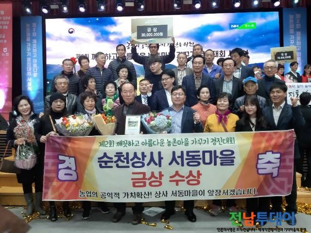 【전남투데이 구정준 기자】순천시는 지난 7일(목) 상사면 서동마을이 농협중앙회가 개최하는 제2회 깨끗하고 아름다운 농촌마을 가꾸기 경진대회에서 ‘마을가꾸기 분야 금상’을 수상했다고 밝혔다.