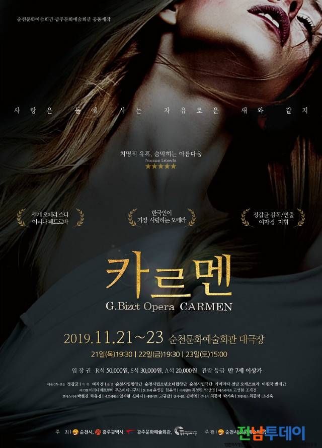 【전남투데이 구정준 기자】순천시는 11월 21일(목) ~ 23일(토) 3일간 비제의 오페라‘카르멘’을 순천문화예술회관 대극장에서 화려한 막을 올릴 예정이라고 밝혔다. .