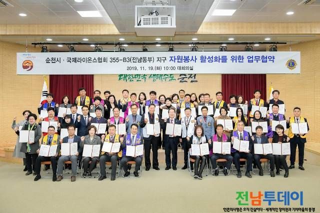 【전남투데이 구정준 기자】순천시(시장 허석)와 국제라이온스협회 전남동부지구(총재 이순기)는 11월 19일‘자원봉사 활성화를 위한 업무협약식’을 가졌다.