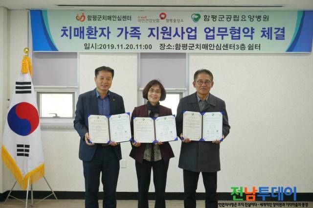 [전남투데이 서영록 기자]함평군보건소(소장 정명희)는 20일 군 치매안심센터에서 국민건강보험공단함평출장소(소장 윤석호)․함평군공립요양병원(병원장 박승룡)과 업무협약(MOU)을 맺고 치매 관리 사업에 공동 협력해나가기로 했다.