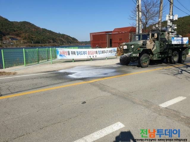 영광군(군수 김준성)은 최근 국내 겨울 철새 도래가 시작되는 등 AI 유입 위험이 증가됨에 따라 차단 방역을 강화하고자 지난 20일부터 불갑저수지 일원에서 공군 제1전투비행단 제독차량을 이용한 소독을 실시했다.