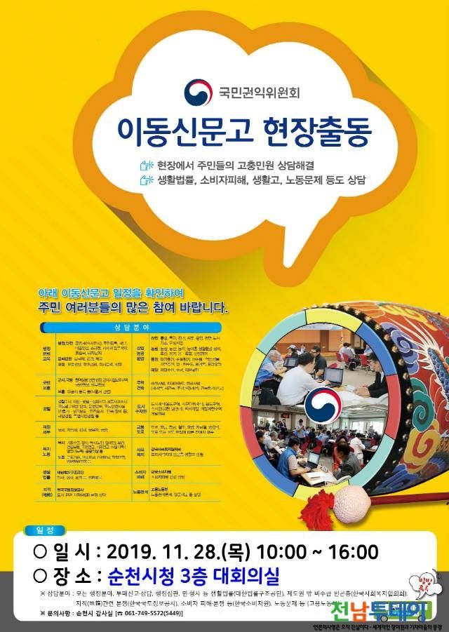 【전남투데이 구정준 기자】순천시는 순천․여수․광양․구례등 전남동부권 주민들의 고충민원 해소를 위해 오는 28일(목) 오전 10시부터 오후 4시까지 시청 대회의실(3층)에서 국민권익위원회의 ‘이동신문고’를 운영한다고 밝혔다.
