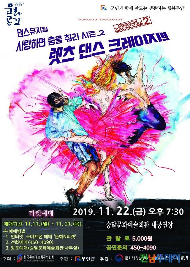 [전남투데이 서영록 기자]무안군(군수 김산)은 『한국문화예술회관연합회 문화공감방방곡곡 공모사업』에 선정된 공연 <렛츠 댄스 크레이지, 사랑하면 춤을춰라 시즌2> 공연을 오는 11월 22일(금) 저녁 7시 30분 승달문화예술회관 대공연장에서 개최한다.