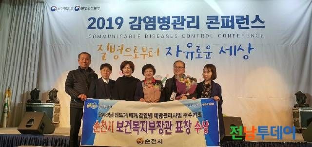 【전남투데이 구정준 기자】순천시보건소는 지난 22일(금) 2019 감염병관리 콘퍼런스에서 ‘진드기 매개 감염병 예방관리 사업’평가 결과 우수기관으로 선정돼 보건복지부장관상을 수상했다고 전했다.