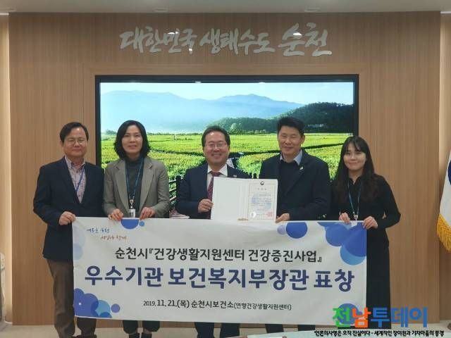 【전남투데이 구정준 기자】순천시(시장 허석)는 지난 21일 강원 평창 알펜시아리조트에서 열린 보건복지부 주최 ‘2019년 전국 건강생활지원센터 건강증진사업 성과평가’에서 연향건강생활지원센터(이하 연향센터)가 우수기관으로 선정돼 보건복지부장관상과 포상금을 수상했다고 밝혔다.