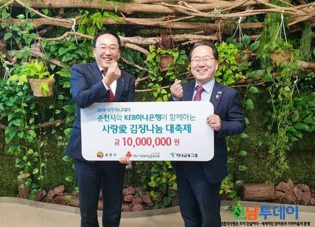 【전남투데이 구정준 기자】순천시는 지난 26일 오전 순천만국가정원에서 허석 순천시장, KEB하나은행 호남영업그룹장(정민식)과 관계자 등이 참석한 가운데 순천시 ‘사랑愛 김장 나눔 대축제’에 1000만원을 기탁하는 기부금 전달식을 가졌다고 밝혔다