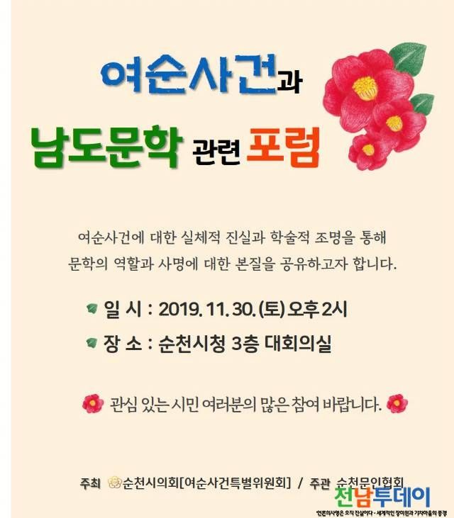 【전남투데이 구정준 기자】순천시의회(의장 서정진) 여순사건특별위원회(위원장 오광묵)가 오는 30일(토) 오후 2시 순천시청 대회의실에서 ‘여순사건과 남도문학 관련 포럼’을 개최한다.
