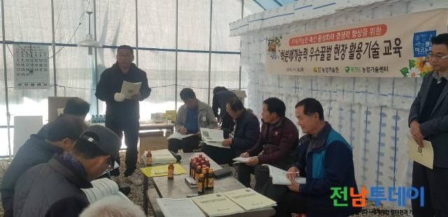 전남농업기술원 축산기술팀과 합동으로 진행된 이번 교육은 화분매개능력이 우수한 꿀벌을 활용해 고품질 과실‧과채류 생산을 유도하기 위해 마련됐다.