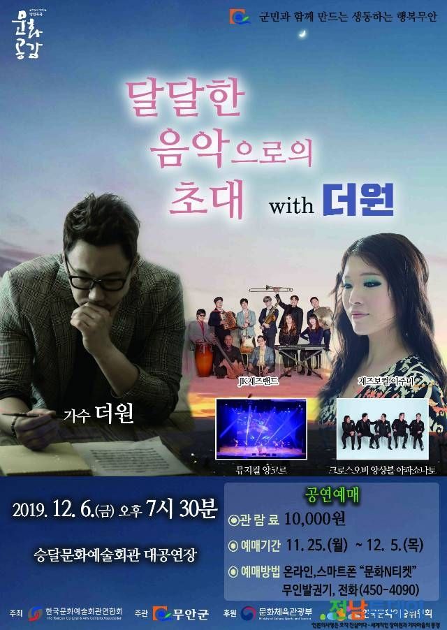 [전남투데이 서영록 기자]무안군(군수 김산)은 『한국문화예술회관연합회 문화공감방방곡곡 공모사업』에 선정된 공연 마지막 작품으로 <달달한 음악으로의 초대 with 더원> 공연을 오는 12월 6일 저녁 7시 30분 승달문화예술회관 대공연장에서 개최한다.