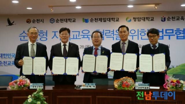 【전남투데이 구정준 기자】전라남도순천교육지원청(교육장 이길훈)은 11월 28일 순천교육지원청 대회의실에서 순천시장, 순천대학교 총장, 순천제일대학교 총장, 청암대학교 관계자 등 50여명이 참석한 가운데‘순천교육 발전 종합대책 수립 순천형 지역교육 협력을 위한 업무협약’을 체결했다.