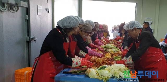 [전남투데이 서영록 기자]절기상 대설(大雪)을 사흘 앞둔 4일 함평군의회 정철희 의장, 허정임 부의장을 비롯한 (사)한국농업경영인․한국여성농업인 함평군연합회원 50여 명이 함평군 신광면 하늘김치공장에서 열린 ‘사랑 나눔 김장담그기’ 행사에 참여해 김장김치를 버무리고 있다.