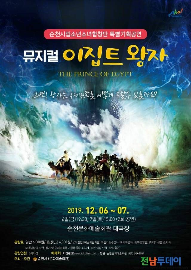 【전남투데이 구정준 기자】순천문화예술회관에서는 오는 12월 6일(금)과 7일(토) 이틀간 2019년을 마무리하면서 가족 모두 볼 수 있는 순천시립소년소녀합창단 특별기획공연 뮤지컬 ‘이집트 왕자’가 공연된다.