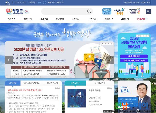 영광군(군수 김준성)은 12월 2일부터 11일까지 2019년 한 해 동안 「군정을 빛낸 우수시책 10건」을 선정하기 위한 설문조사를 진행한다고 밝혔다.