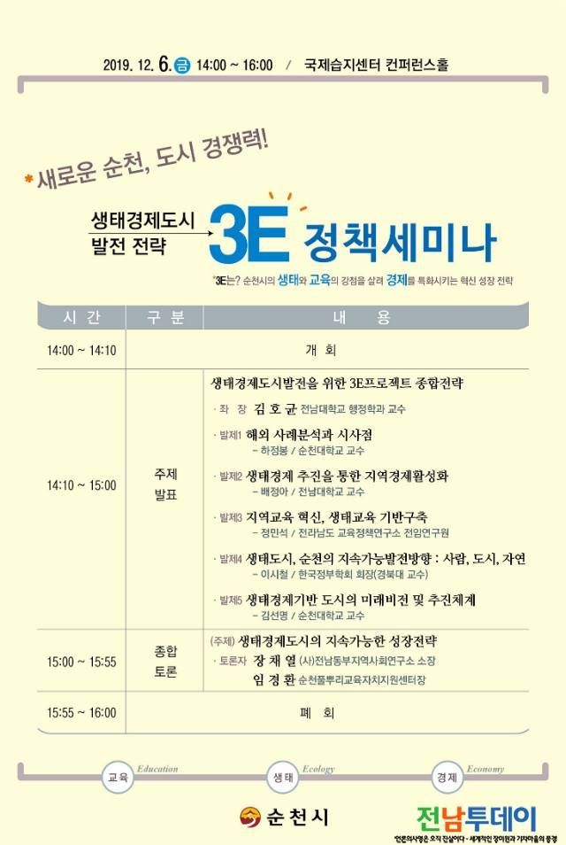 【전남투데이 구정준 기자】순천시는 오는 12월 6일(금) 국제습지센터 컨퍼런스홀에서‘생태경제도시발전을 위한 3E프로젝트 종합 비전 수립’을 주제로 정책세미나를 개최한다고 밝혔다.