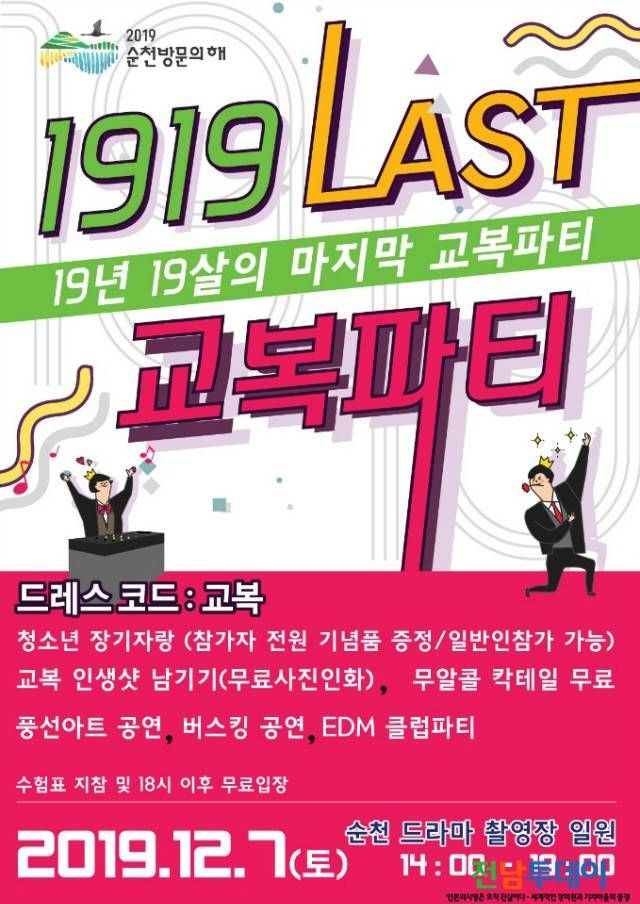 【전남투데이 구정준 기자】순천시는 오는 7일 토요일 오후 2시부터 7시까지 순천드라마촬영장에서 수험생들을 대상으로 ‘1919 Last 교복파티’와 함께 코리아둘레길 홍보 이벤트를 개최한다고 밝혔다.