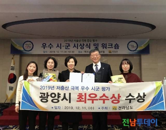 【전남투데이 구정준 기자】광양시는 전라남도 저출산 극복 추진 종합평가에서 최우수기관으로 선정되어 지난 11일(수) 전남도지사 최우수상 표창 및 시상금을 수상했다고 밝혔다.