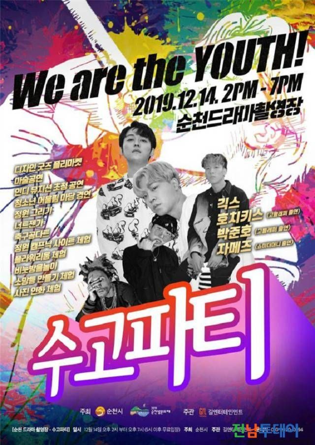 ‘2019 청소년 어울림마당’과 연계해 개최되는 ‘수고파티’는 지역 청소년들의 끼 경연대회, 마술쇼, 지역인디뮤지션 공연, 체험 및 마켓부스 등 다양한 즐길거리와 먹을거리가 준비된다. 또한 참가자들에게는 추첨을 통해 에어팟 2세대, 나이키 플리스 등 연말 선물 증정 이벤트도 함께 진행될 예정이다.