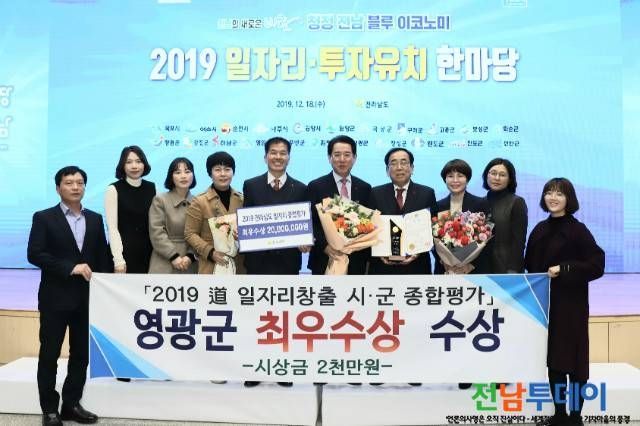영광군(군수 김준성)은 지난 18일 ‘전라남도 일자리·투자유치 한마당’행사에서 2019 일자리창출 종합평가 ‘최우수상’ 수상과 함께 시상금 2천만 원을 받았다고 밝혔다.