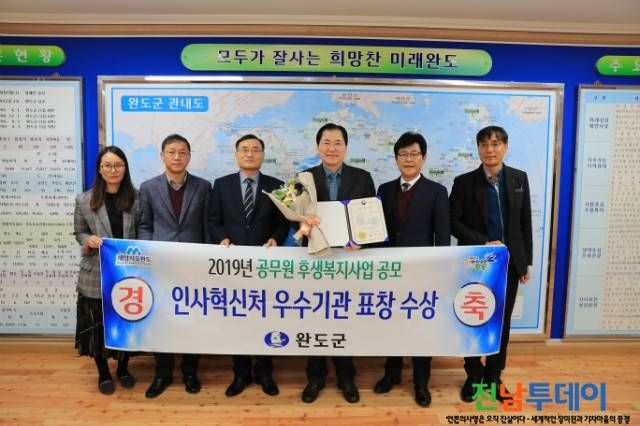 [전남투데이 김오례기자]완도군(군수 신우철)은 인사혁신처 주관 ‘2019년 공무원 후생복지사업 우수사례’ 공모에서 기초자치단체 중 유일하게 우수상을 수상했다고 20일 밝혔다.