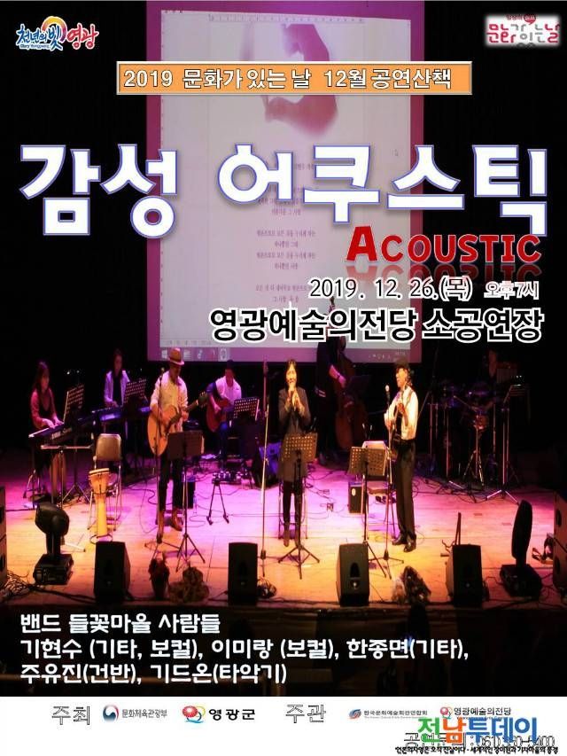 영광군(군수 김준성)은 오는 26일 오후 7시에 영광예술의전당 소공연장에서 문화가 있는 날 공연산책 ‘감성 어쿠스틱’을 공연한다.
