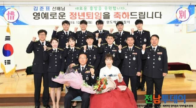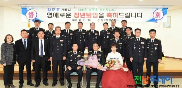 [전남투데이 김오례기자]완도해양경찰서(서장 김충관)는 오늘 31일 오전 10시 3층 강당에서 직원, 가족, 내빈 등 100명이 참석한 가운데 김준표 파출소장의 퇴임식을 가졌다고 전했다.