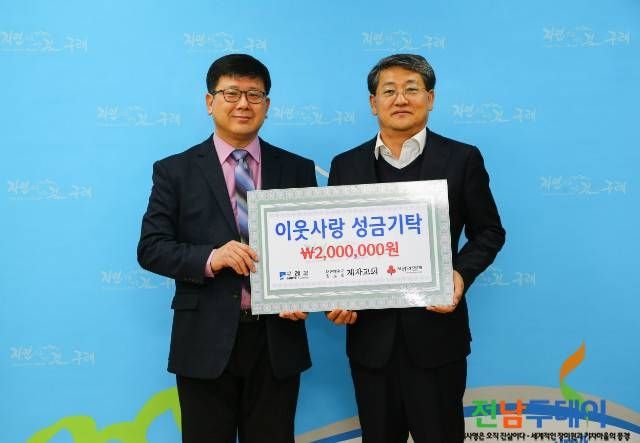 지난 16일 대한예수교 장로회 구례제자교회(담임목사 김도형)가 어려운 이웃을 위해 200만 원을 기탁한 훈훈한 사실이 알려졌다. 제자교회는 교인들이 붕어빵과 팝콘을 판매한 수익금과 추수감사절 감사예물을 보태어 기탁금을 마련했다고 밝혔다.