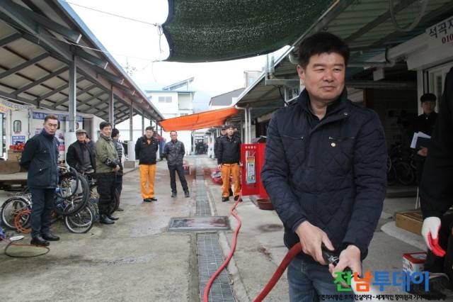 지난 31일, 곡성군 석곡 전통시장에서 자율소방대장 김종희씨가 비상소화장치를 사용해 화재를 진압하는 훈련을 진행하고 있다.