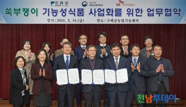 구례군(군수 김순호)과 농촌진흥청 국립농업과학원(원장 김두호), SK바이오랜드는 14일 구례군농업기술센터에서 구례군 쑥부쟁이를 활용한 건강기능성식품 사업화와 응용기술개발 연구를 위한 상호협력에 관한 업무협약을 체결했다.