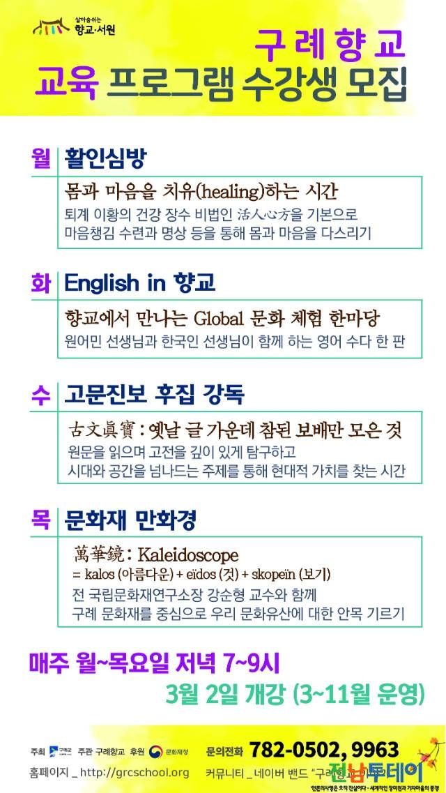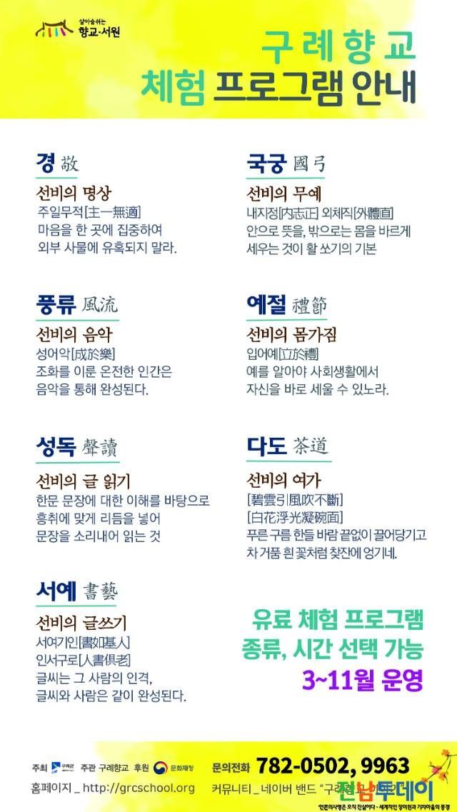 김한섭 전교는 “구례향교 활용사업은 문화재청 우수 사업으로 선정된 바 있으며, 꾸준한 인기를 얻고 있다.”며, “올해는 한층 다채로운 프로그램이 준비되어 있으니 기대하셔도 좋다.”고 밝혔다.