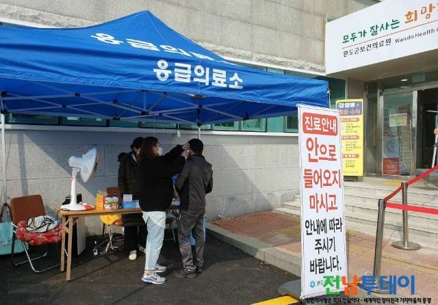 완도군 보건의료원에서는 진료를 받으러 오신 진료 방문객에 대하여 사전 문답 및 체온 측정 후 일반 환자는 진료 팀으로, 의심 환자는 선별 진료소에서 진료 받을 수 있도록 하는 등 코로나19 감염증 예방에 최선을 다하고 있다.