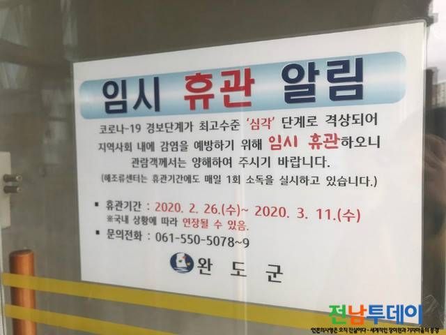 [전남투데이 김오례기자]완도군은 코로나19 감염병 위기 경보가 심각 단계로 격상됨에 따라 지역 대표 관광시설과 다중이용시설 운영을 임시 중단한다고 밝혔다.