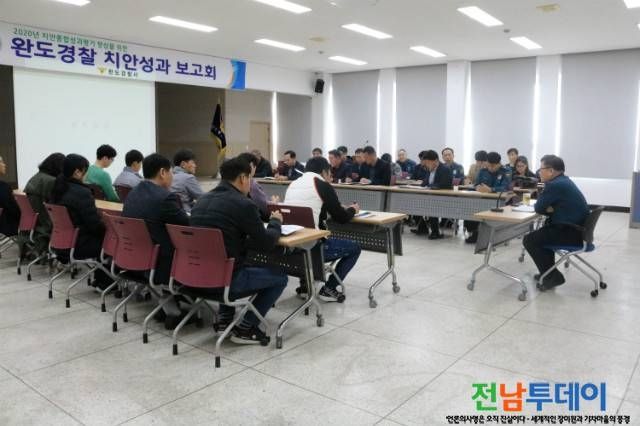 [전남투데이 김오례기자]완도경찰서(서장 김범상)는 13일 경찰서 3층 회의실에서 과장, 계·팀장, 기능별 성과담당 등 30여명이 참석한 가운데 2020년 치안종합성과평가 향상을 위한 완도경찰 치안성과 보고회를 개최했다.