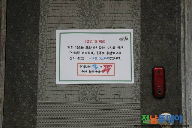[전남투데이 김오례기자]정부에서 코로나19 확산 방지를 위해 집단 감염 위험시설 운영 중단을 권고하고 있는 가운데 완도군 관내 유흥주점에서도 휴업을 결정하는 등 사회적 거리두기에 적극 동참하고 있다.