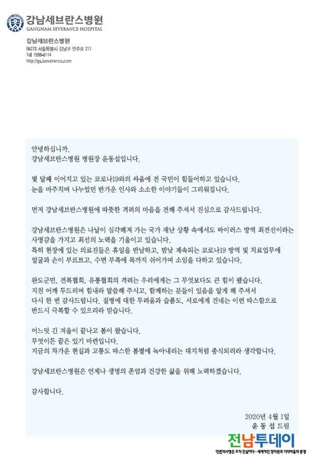 [전남투데이 김오례기자] 완도군은 지난 2일, 서울시 강남구에 위치한 강남세브란스병원장으로부터 감사 인사가 담긴 서한문을 받았다고 밝혔다.