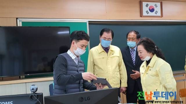 [전남투데이 김오례기자]완도교육지원청(교육장 김명식)은 완도군청(완도군수 신우철)과 함께 온라인 개학을 맞이한 관내 군외초등학교를 방문하여 실시간 쌍방향 온라인 수업을 하고 있는 선생님을 격려하였다.