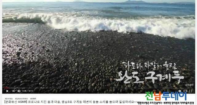 지난 4월 24일, 8번째로 공개한 영상에는 국가명승 제3호인 완도 정도리 구계등 몽돌해변 풍경과 파도소리(약 18분)를 ASMR를 활용해 제공하고 있다.