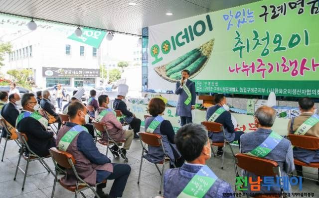 구례오이의 우수성을 널리 알리고, 코로나19로 인한 오이 소비 감소를 극복하기 위한 오이 판촉 및 홍보 행사가 지난 5월 7일 오이 재배 농업인, 주민 등 200여 명이 참석한 가운데 (사)구례군시설원예연합회(회장 전기로)와 구례농협 공동 주관으로 진행되었다.