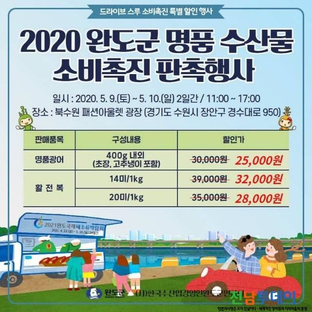 이번 드라이브스루는 완도군수산경영인회 주관으로 5월 9일~10일(오전 11시~오후 5시)까지 경기도 북수원 패션아울렛 앞 광장에서 열린다.