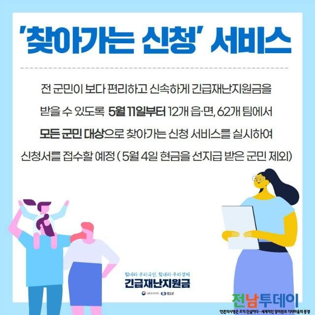 전 군민이 보다 편리하고 신속하게 긴급재난지원금 신청 서비스를 받을 수 있도록 5월 4일 현금을 선지급 받은 대상자를 제외한 모든 군민을 대상으로 5월 11일부터 12개 읍면, 62개 팀에서 해당 주민을 직접 방문하여 신청서를 접수하는 적극행정을 펼칠 예정이다.