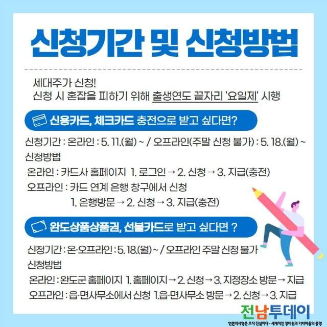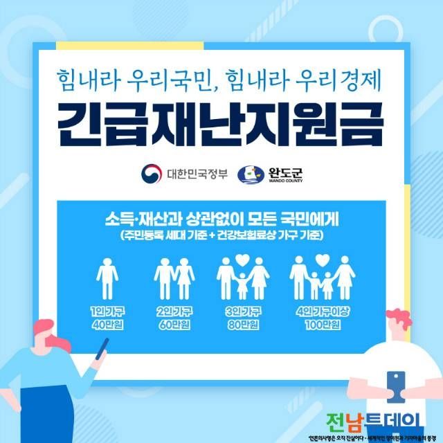 [전남투데이 김오례기자]완도군은 오는 11일부터 전 군민 25,908가구 대상으로 정부 긴급재난지원금을 ‘찾아가는 신청’ 원칙으로 접수를 실시한다고 밝혔다.