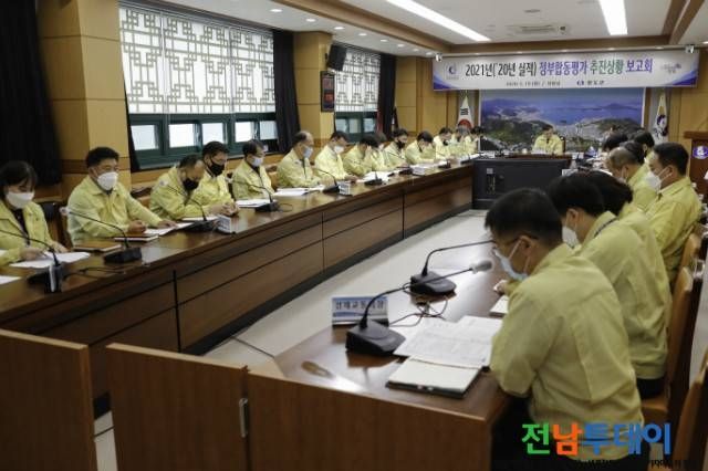 [전남투데이 김오례기자]완도군은 지난 19일 군청 상황실에서 13개 부서의 지표담당 팀장 40여 명이 참석한 가운데 국정 주요 시책 추진 상황 등을 평가하는 2021 정부합동평가 대비 추진 상황 보고회를 개최했다.