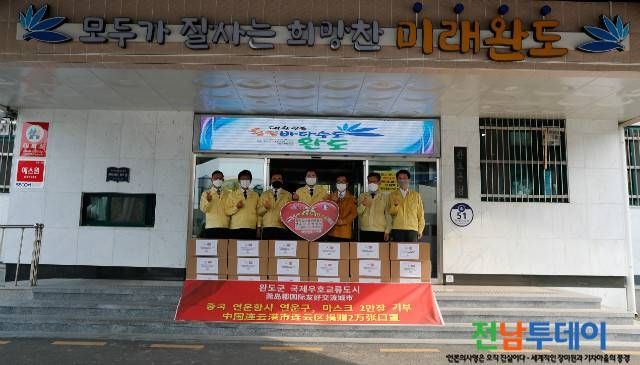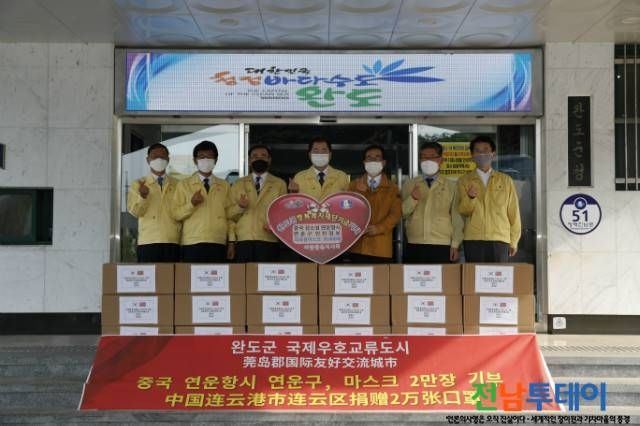 [전남투데이 김오례기자]완도군은 지난 27일, 우호 교류 도시로 결연을 맺고 있는 중국 장쑤성 연운항시 연운구로부터 코로나19 예방을 위한 구호 물품을 지원받았다고 밝혔다.