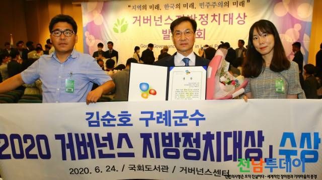 [전남투데이 / 장형문 기자] 김순호 구례군수는 24일 국회에서 열린 ‘2020 거버넌스 지방정치대상’ 시상식에서 공동체 역량 증진 부문 우수상을 수상했다.