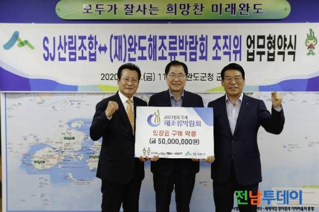 [전남투데이 김오례기자](재)완도해조류박람회 조직위원회(위원장 신우철)는 26일 SJ산림조합(중앙회장 최창호, 완도군조합장 박진옥)과 2021완도국제해조류박람회 성공 개최를 위해 적극 협력키로 했다고 밝혔다.