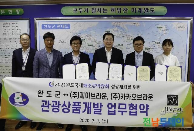 완도군에 따르면 7월 1일 완도군청에서 신우철 완도군수와 정영택 ㈜제이브라운 대표가 참석하여 해조류를 활용한 먹거리 관광 상품을 개발하는데 협력하기로 업무 협약을 체결했다고 밝혔다.