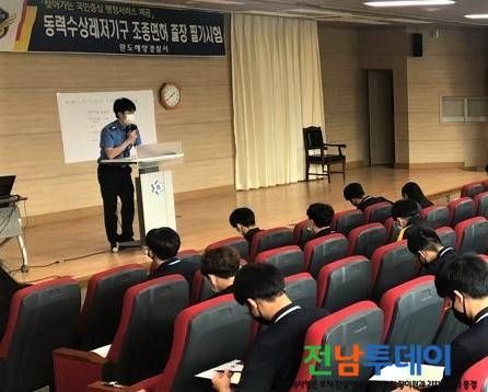 완도해경은 완도수산고등학교 교직원 및 학생 다수가 자격 취득을 희망하였으나 코로나19의 위험과 학사일정으로 인하여 정기 및 PC시험을 응시하기 어려워 직접 방문하여 필기시험을 집행하게 되었다고 전했다.