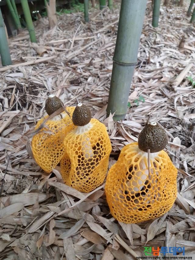 담양군에 위치한 한국대나무박물관 내부 대나무숲에 드레스를 입은 듯한 망태버섯이 아름다운 자태를 뽐내고 있다.